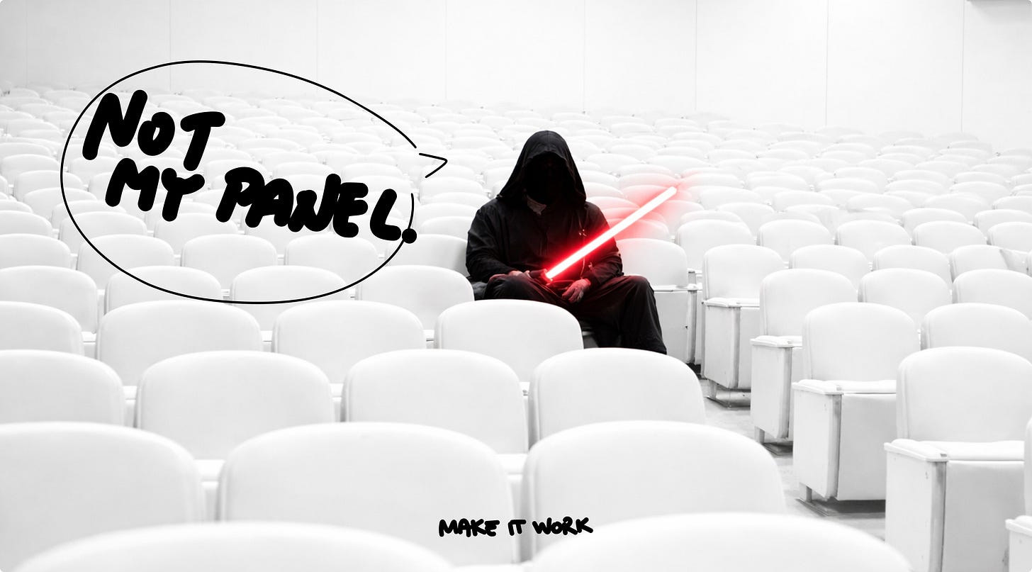 And this isn’t just on the organizers (that part is obvious, it’s just easier to build it that way). The speakers are complicit too — happily talking to each other while the audience sits there, checked out or scrolling their phones.