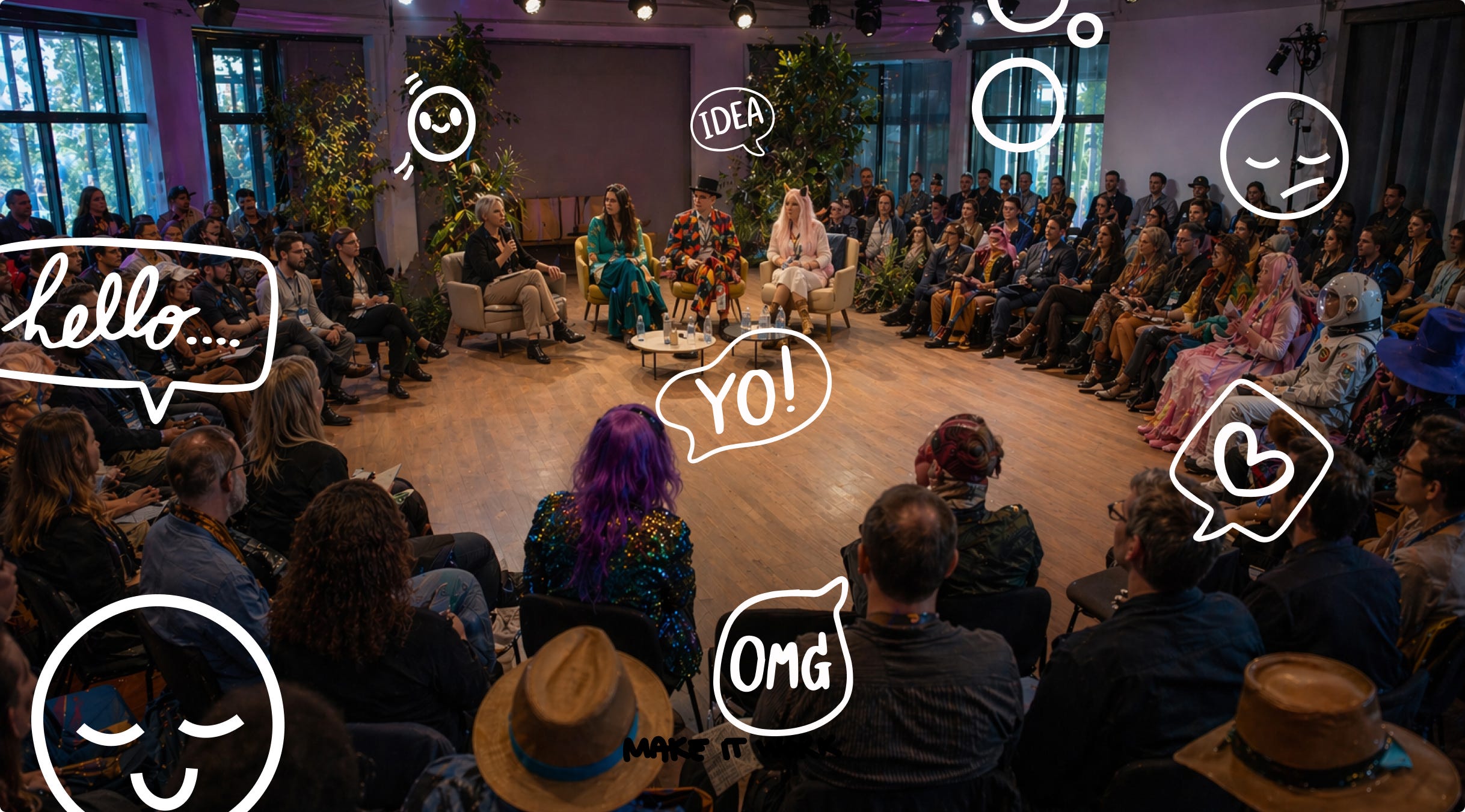 The physical space sets the rules of participation. Experts on a stage elevated above the room make one thing clear before anyone speaks: some are here to talk, others to watch. The space dictates the roles.
