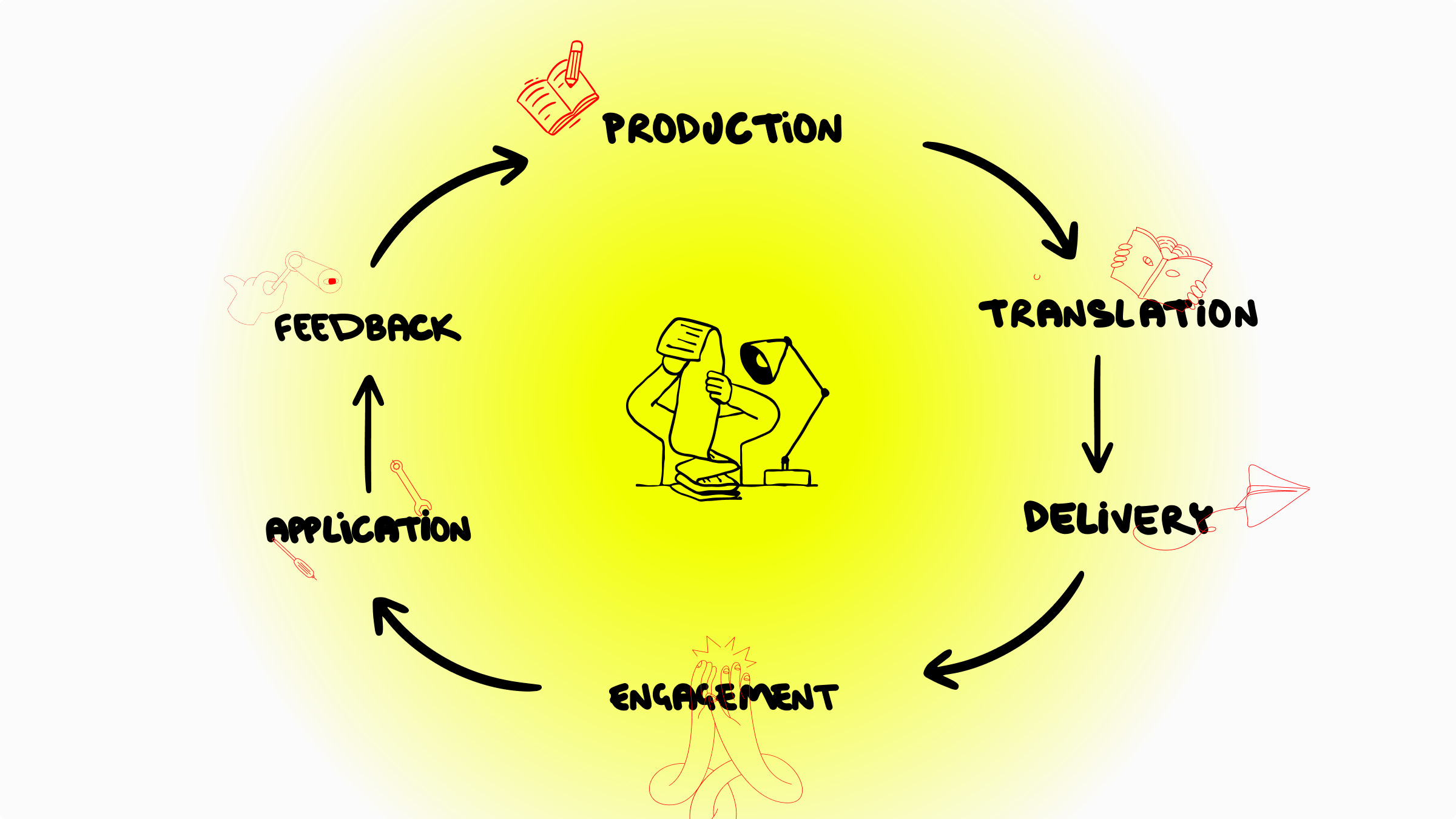 From there, it moves into delivery, where it is structured and distributed through appropriate channels, formats, and moments of use. Engagement follows, as people interact with it: recognizing its relevance, connecting it to their own reality, and understanding what it might change.