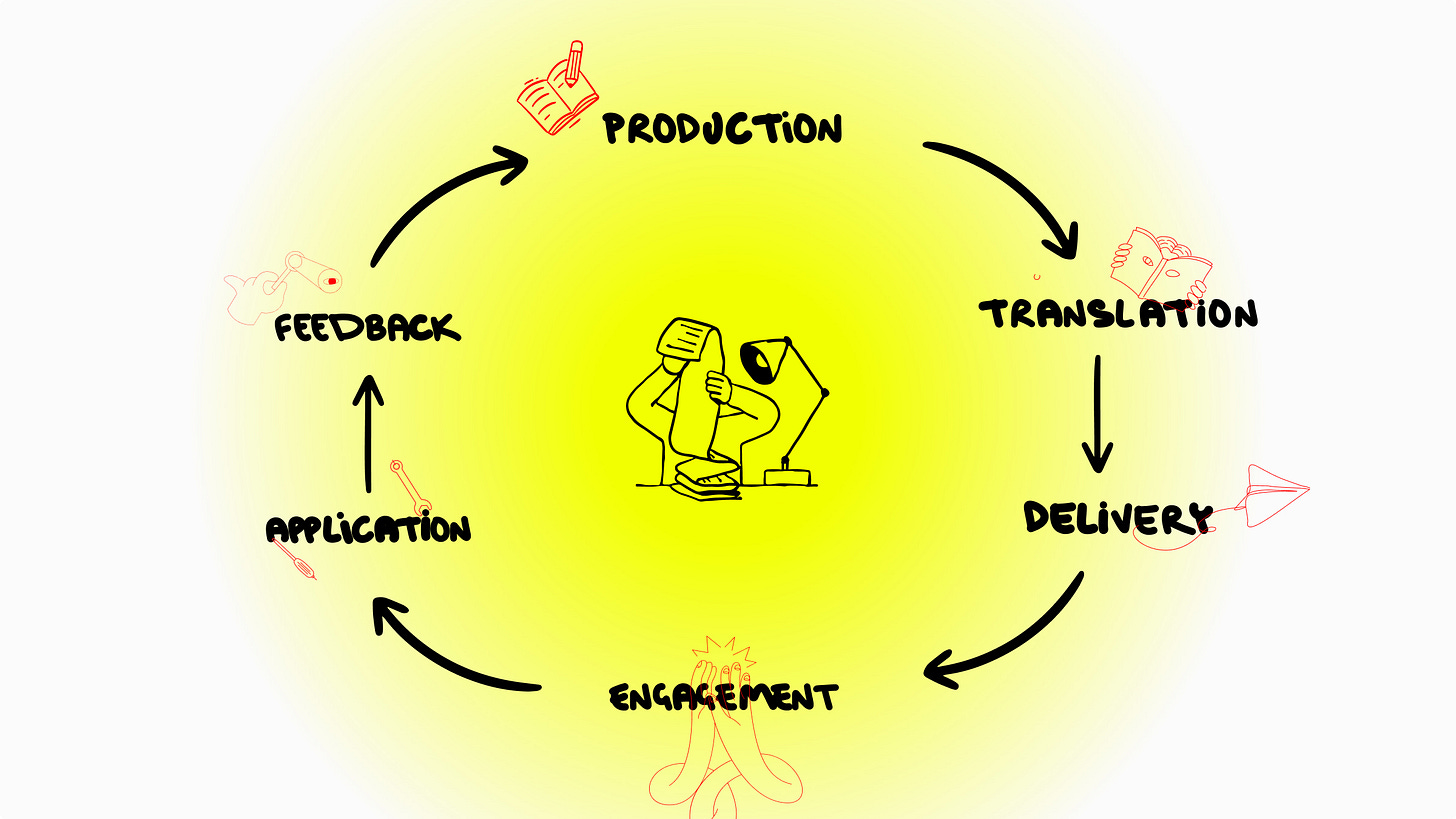 A lifecycle of knowledge begins with production — the creation of new knowledge (research, insights, and expertise). This knowledge is then translated: interpreted, broken down, reframed, and grounded in context and experience so that it becomes understandable and related for different audiences.
